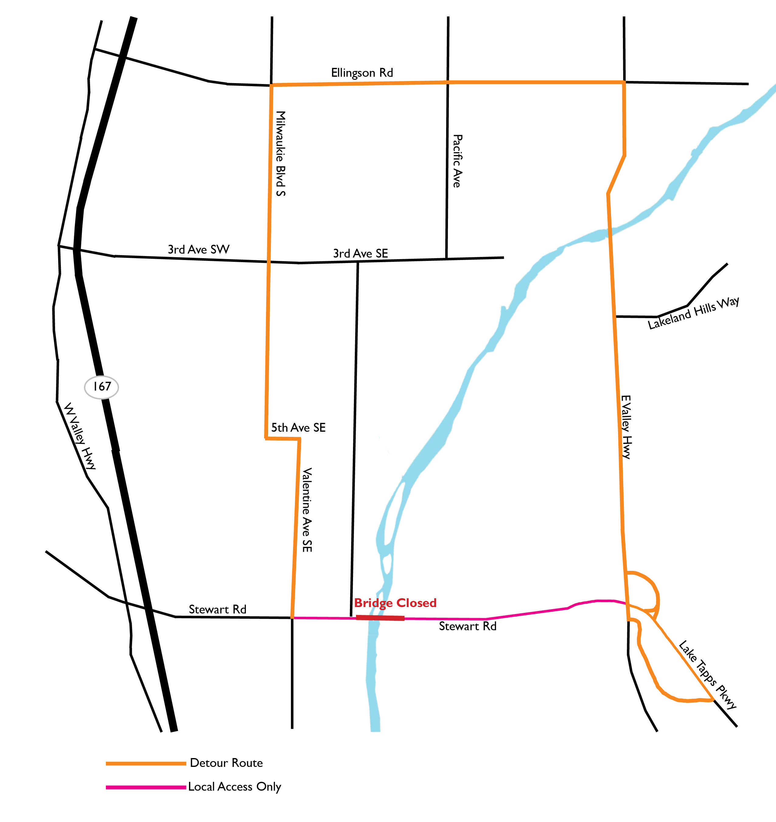 - Girder delivery and installation will be on the nights of 10/09/25 & 10/10/25. There will be a full closure of Stewart road during this time. The closure will be on the night of 10/09/25 from 8pm to 5am and the night of 10/10/25 from 8pm to 6am. Detour routes will be provided. Please see overview map of detour route below.